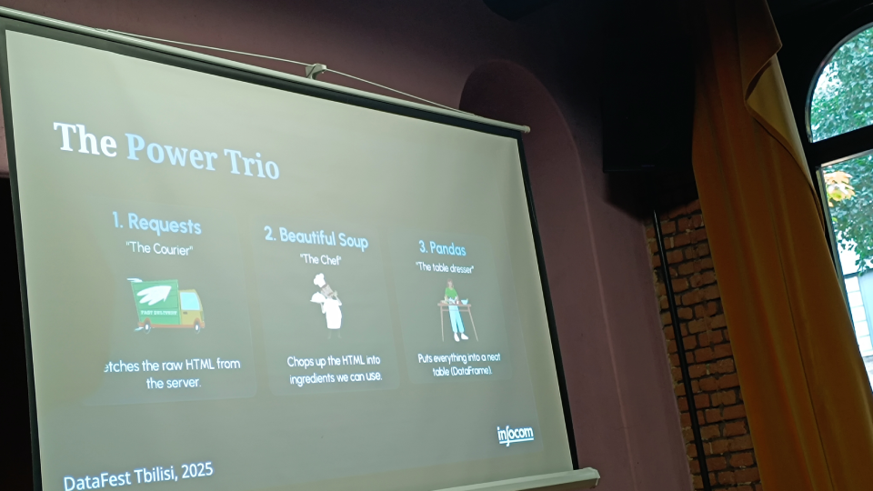 Ինֆոքոմի լրագրող Կատյա Մամյանը DataFest Tbilisi-ին ներկայացնում էր, թե ինչպես ԱԲ գործիքների միջոցով գրել Python կոդեր, որոնց միջոցով կարելի է տվյալներ քերել կայքերից ու դրանք օգտագործել հանրային բարիքի՝ լուսաբանման համար։